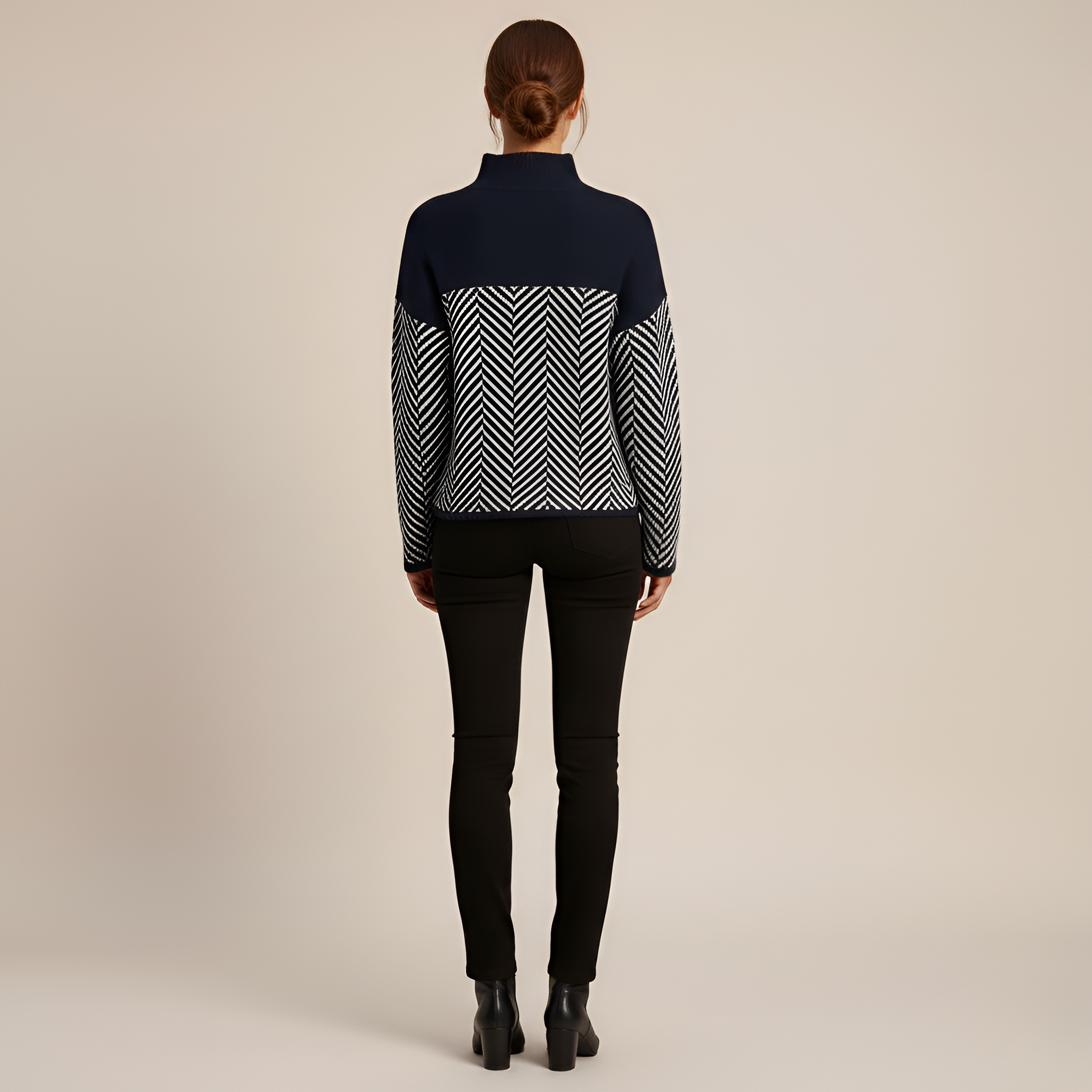 Tento dámsky sveter je vyrobený z mäkkej zmesi vlny, ktorá poskytuje príjemnú rovnováhu medzi teplom a pohodlím. Dizajn má vysoký golier a grafický vzor pletenia, ktorý vytvára čistý a moderný vzhľad. Strih je voľný a umožňuje dobrú pohyblivosť, vďaka čomu je sveter pohodlný na nosenie počas celého dňa. Univerzálny sveter z vlnenej zmesi na prácu, bežné nosenie a chladné dni.